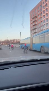 В Подмосковье заметили «отца года», который с семьей на питбайках уверенно двигался по дороге, обгоняя автобус.