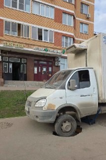В итоге имеем дыру посреди тротуара и шустро смотавшегося в закат водителя газели вместе с машиной.